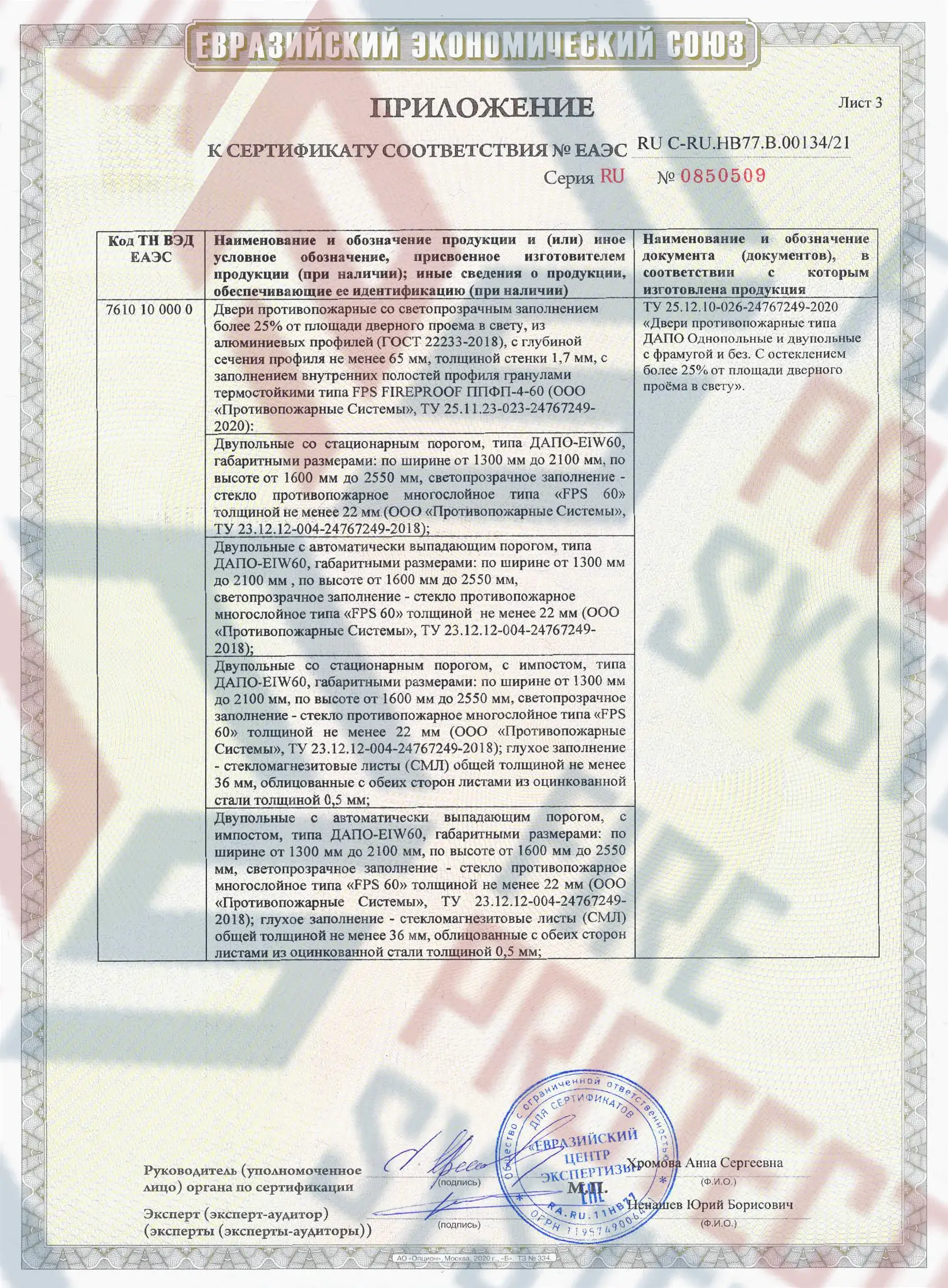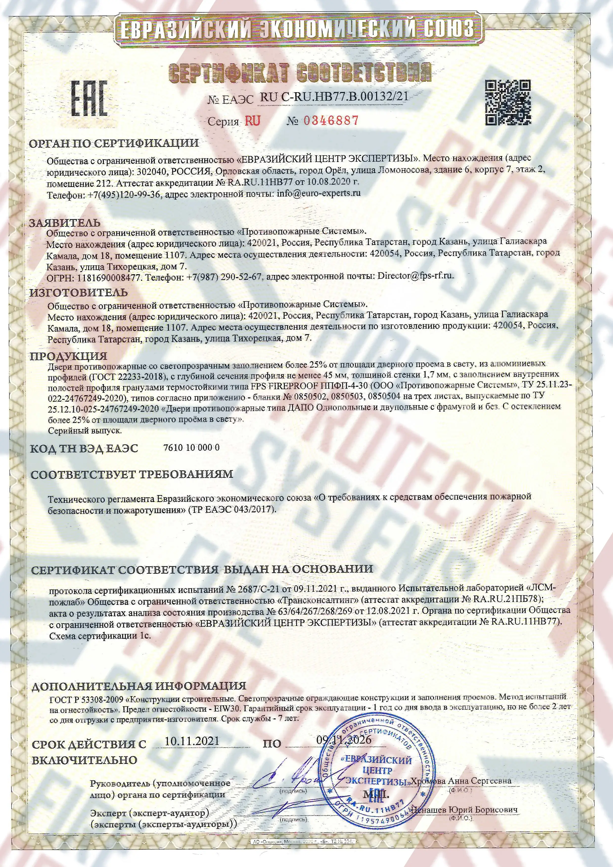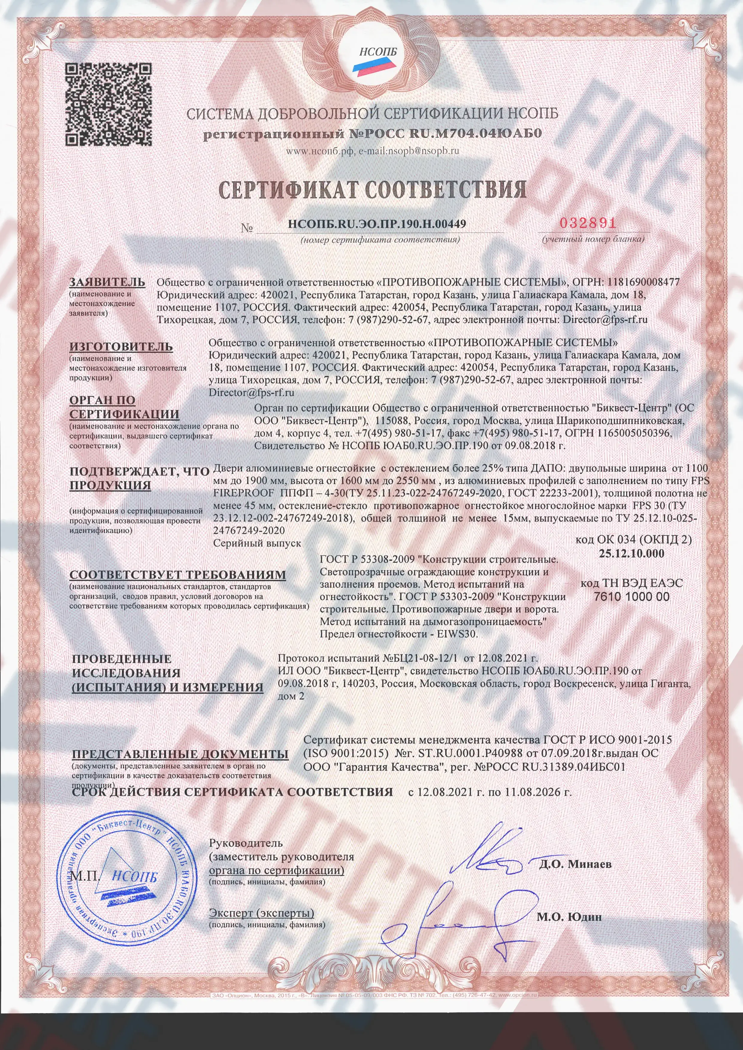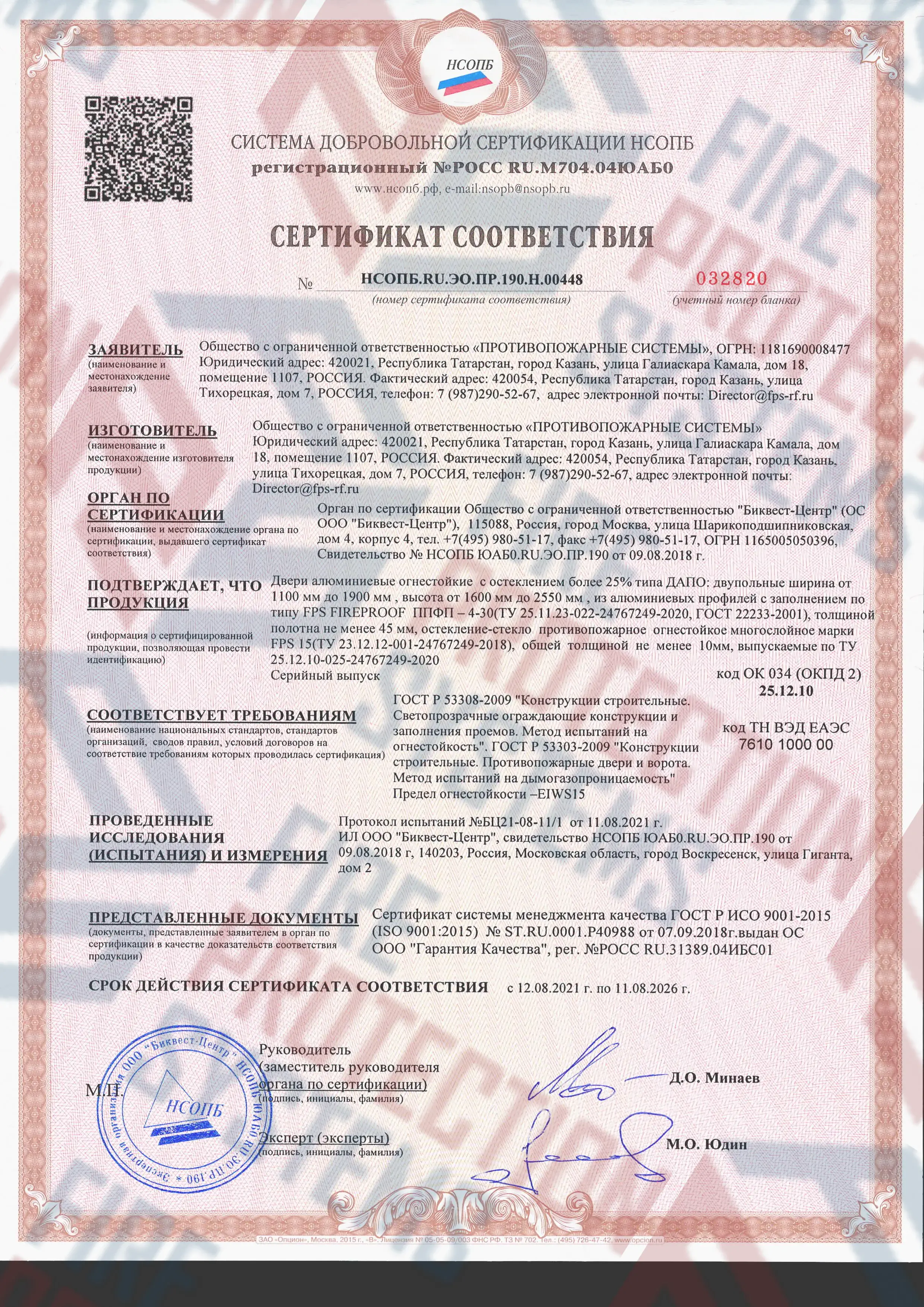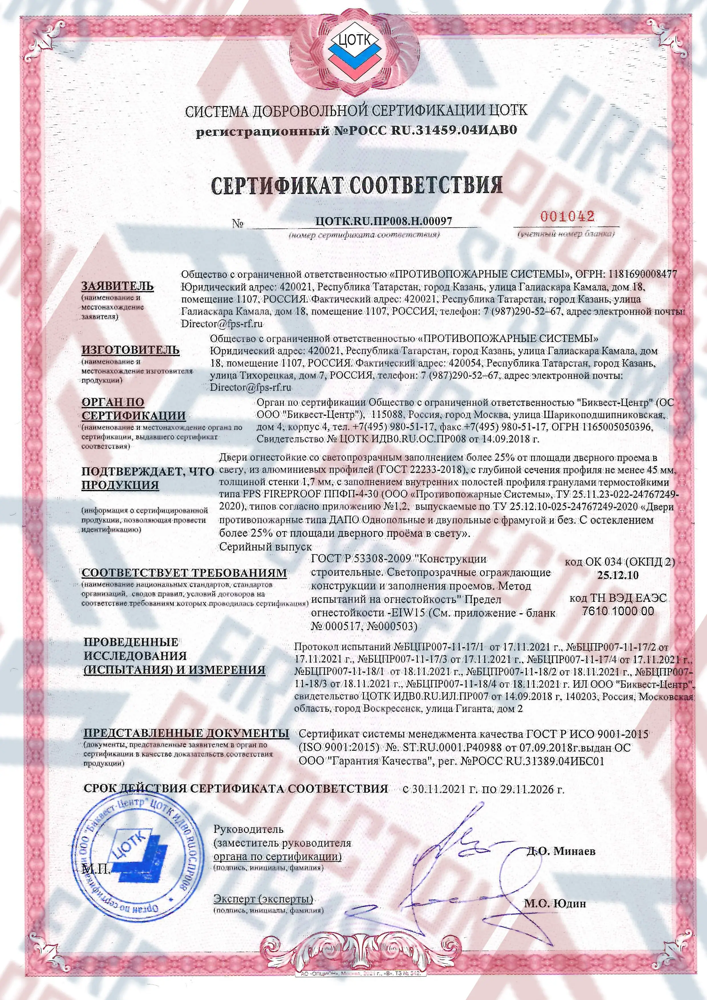 Проверенная огнестойкость – сертифицированный класс EIW 15 (15 минут целостности + теплового излучения);